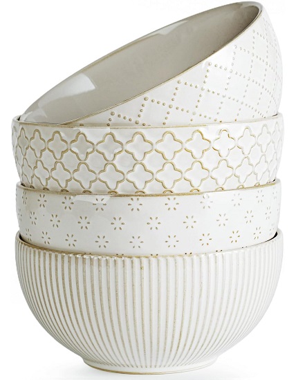【Durable Stoneware】Made of premium ceramic, crafted with a farmhouse decor finish, embossed with 4 different patterns, this aesthetically-pleasing ceramic bowls set offer scratch resistance and durability, ensuring long-lasting use.