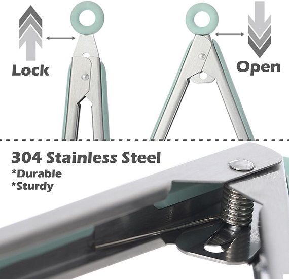 "Kickstand" on the side doesn’t let the utensils touch the counter which is great for when it’s dirty. Lock feature keeps your cooking tongs from opening and closing accidentally, you've got total control.